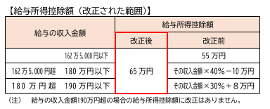 さらに、給与取得控除も収入から引いた上で所得の計算を行いますので、その金額についても下記の表の通り、変更となります。